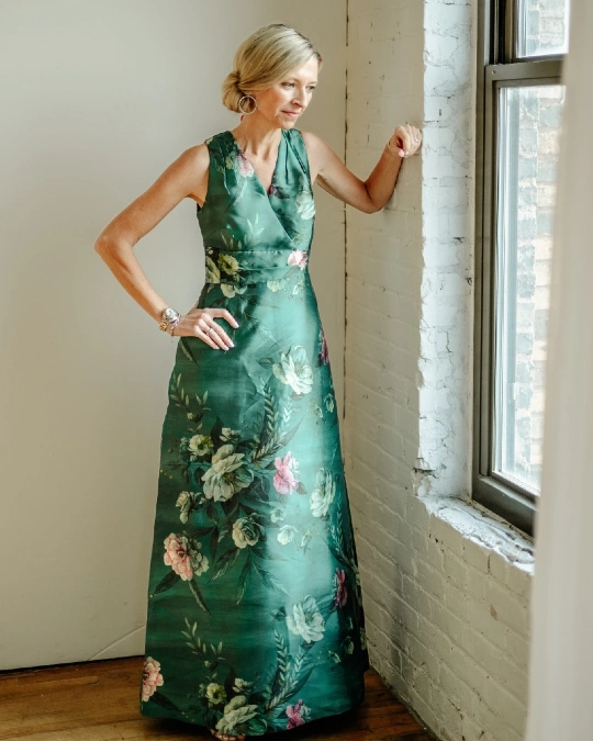 1. Emerald Floral Surplice Gown