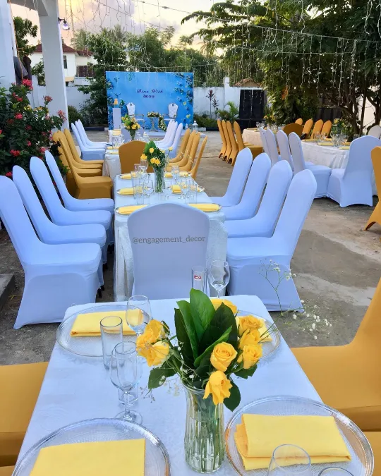 Unquestionably, using bold, contrasting colors in your seating arrangements instantly elevates a simple outdoor space. Economical white chair covers are dramatically punctuated by mustard yellow accents, creating a high-end, structured look.