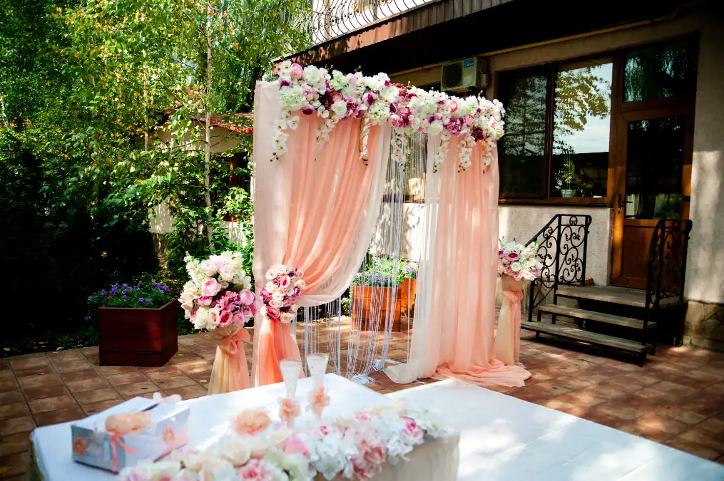 Skillfully, inexpensive sheer fabric draped over a simple frame instantly provides a romantic, airy backdrop for the party. The soft peach color creates a warm glow, adding elegance without needing expensive structured walls.