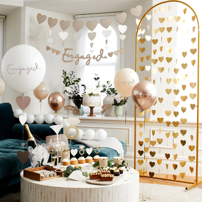 Furthermore, using custom printed large balloons and small novelty cake toppers ties the engagement theme together effectively. This strategy demonstrates that concentrated paper and balloon elements can replace costly floral arrangements.