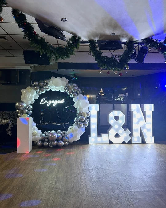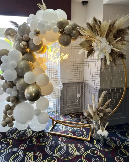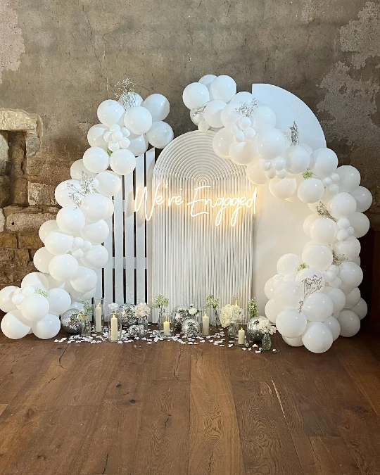Furthermore, framing a central neon sign with an economical silver and white balloon wreath enhances the display dramatically. This striking arrangement offers guests a highly modern and glamorous photo opportunity.