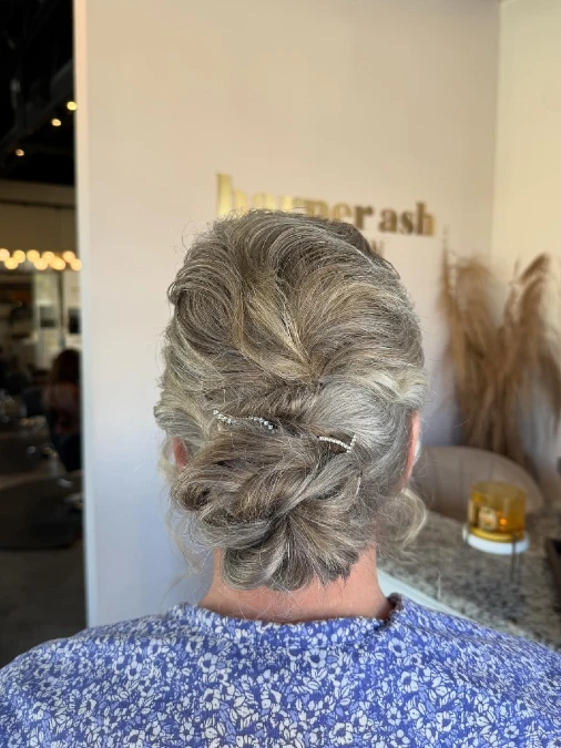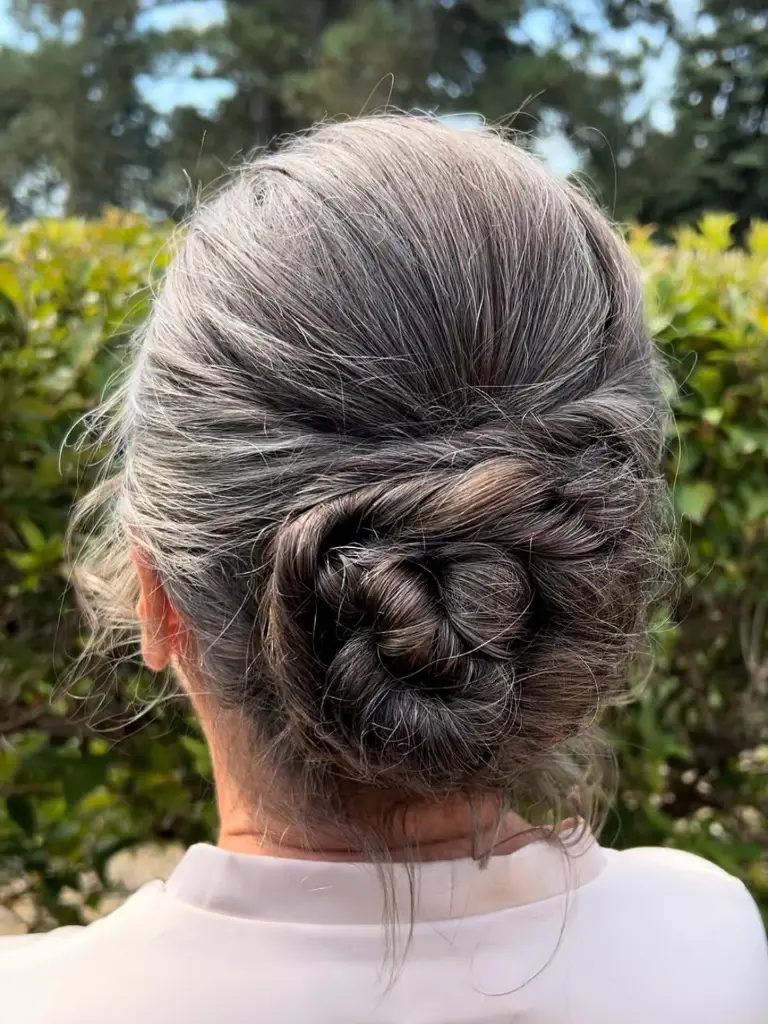 Beautifully, the silver strands weave together to form a sophisticated floral shape. Keeping the styling low at the nape provides a polished and classic silhouette. Smoothly, the hair is gathered back to ensure the focus remains on the intricate bun.
