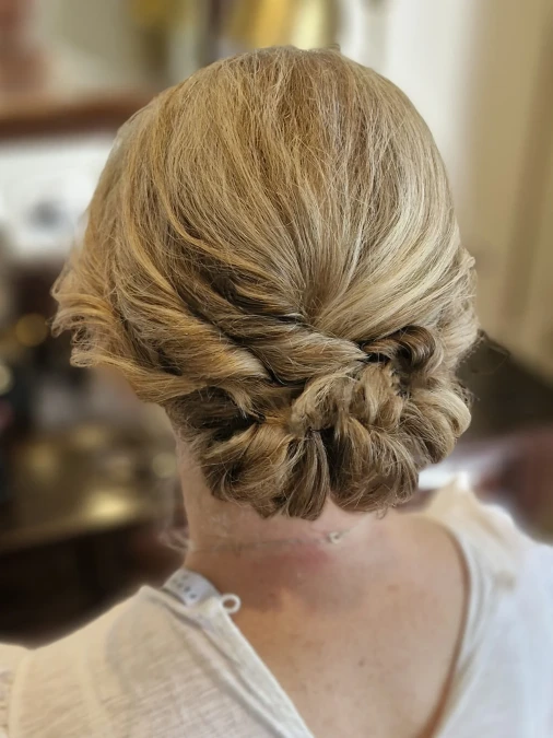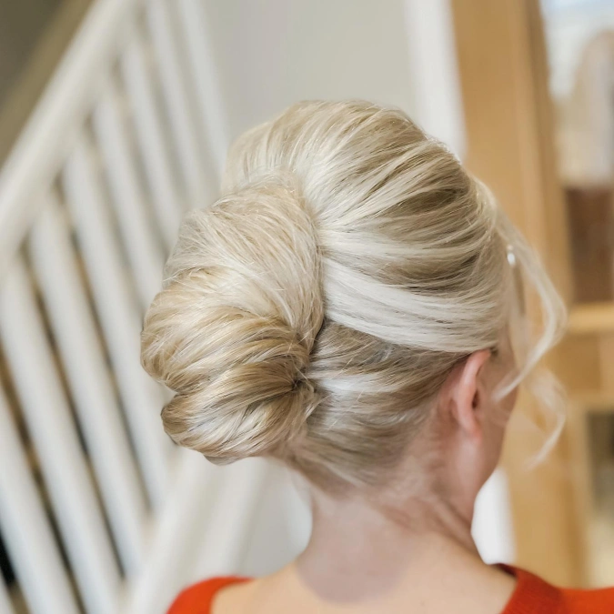 Expertly, this smooth styling technique pulls hair upward to create significant volume at the back. Sweeping the blonde strands tightly ensures a clean and sophisticated finish for the occasion. Softly, a few loose tendrils frame the face to keep the look relaxed and flattering.