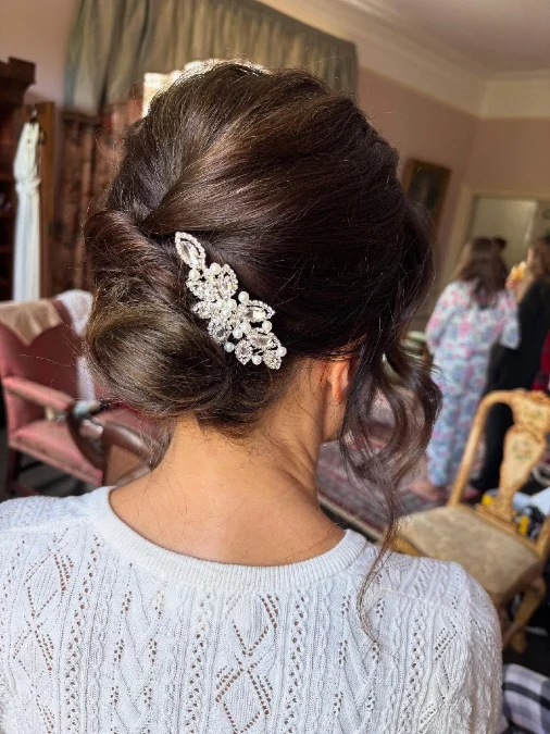 Spectacularly, a pearl and crystal hair slide adds a focal point of glamour. Securing the hair this way ensures it stays put through emotional moments and dancing. Choosing this accessorized style elevates a simple outfit into something truly wedding ready.