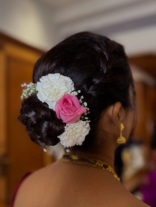 Vibrantly, fresh white and pink flowers act as a stunning focal point. Tucking real blooms into the hairstyle brings a natural and festive energy to the look. You will feel radiant wearing this traditional style for the special celebration.