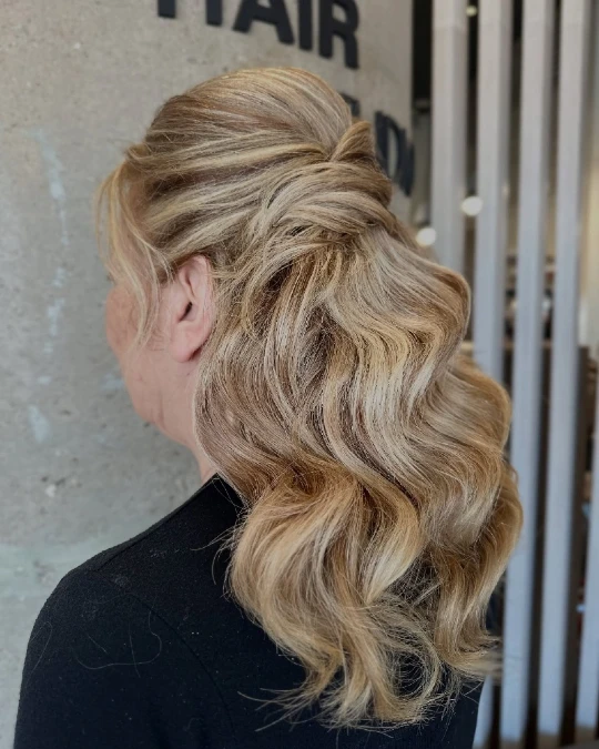 Elegantly, this half up style offers the sophistication of an updo while keeping soft length. Wearing this feminine shape beautifully complements off-the-shoulder or V-neck gown styles. The secure twist ensures the look stays fresh while you move through the evening confidently.