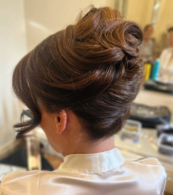 Undeniably, adding significant height at the crown lifts facial features beautifully for a youthful effect. Teasing the roots creates a structured base that stays secure and comfortable all day long. Loose wisps falling gently near the cheeks soften the jawline to flatter the face shape.